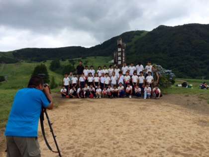 ハチ高原のモニュメントの前で集合写真を撮った後は、高原で昼食タイム。活動班ごとにシートを寄せて敷いて、お弁当を食べました。