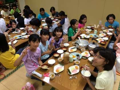 朝会のときから「お腹すいた…朝ごはんはまだかな」と、みんなが待ち遠しくしていた朝食です。しっかり食べて、今日一日の活動に備えましょう。おいしそうに、楽しそうに食べてます。