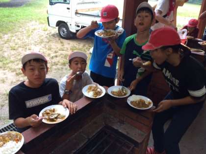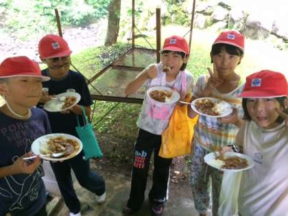 各班、力作のカレーライスを持って記念撮影をしました。その後は、班ごとに、カレーのできばえを確かめあいました。苦労して作ったカレーライスはとりわけおいしく、みんなで「おいしいね!」と言いながら完食していました。