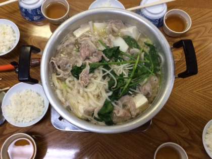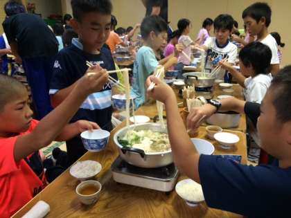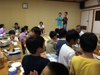 林間学習2日目の夕食は、カモ鍋でした。昨日と同様に食事係が鍋を用意して、班のみんなで鍋をつついて食べました。1日たっぷりと活動した子どもたちは、いつもにも増して本当によく食べますね。みんな元気いっぱいです!