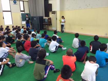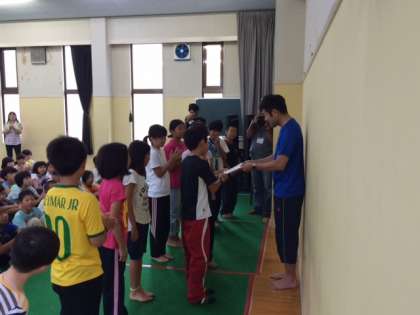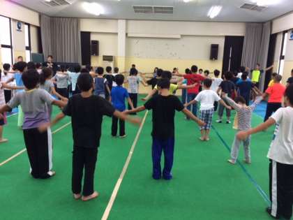 4階多目的ホールに集まり、朝の会をしました。ラジオ体操をしたあと、昨日のカレーコンテストの発表も行いました。