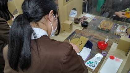 友禅染の歴史を学び、好きな型を選んで、染めました。一人で黙々と作業をするかと思っていたのですが、お互いの作品をほめ合ったり、染料を貸し借りしたり、和やかな時間となりました。