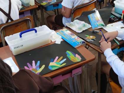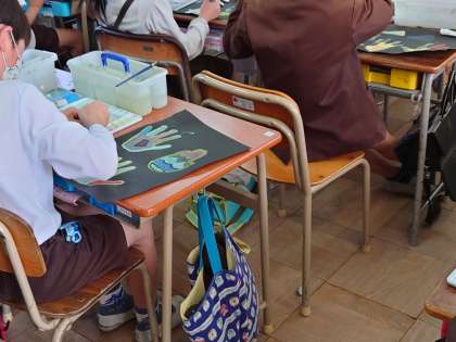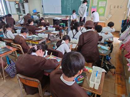 4年生の図画工作科の学習の様子です。自分の手を画用紙に型取って、思い思いに色をつけていっていました。色鮮やかな手形がどんどんできあがっていました。どんな作品になるのか楽しみです。