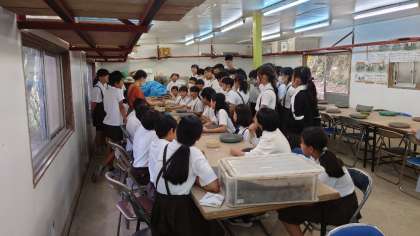 陶芸の説明をしていただいています。みんな真剣に聞いています。
