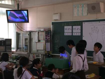 子どもたちが手洗いをした後、実際にきれいに洗えているか、ブラックライトを当てて手洗いチェックをしました。
