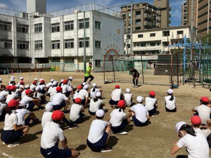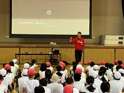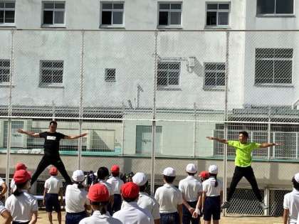 走幅跳の荒川さん、10種競技の宮川さんにお越しいただき、トップアスリート夢授業がありました。講演会や実技指導をしていただきました。体を前に倒し、空き缶を踏むイメージで走ると速く走ることができるそうです。
