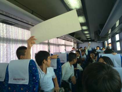 はじめの目的地である志摩スペイン村をめざしてバスは順調に進んでいます。車内の子どもたちは元気いっぱい!クイズなどのレクリエーションをして楽しんでいます。
