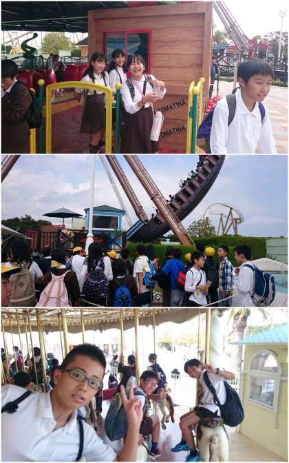 昼食を終え、パルケエスパーニャ(スペイン村)で班活動を行っています。みんなで声をかけあい、楽しく活動しています。