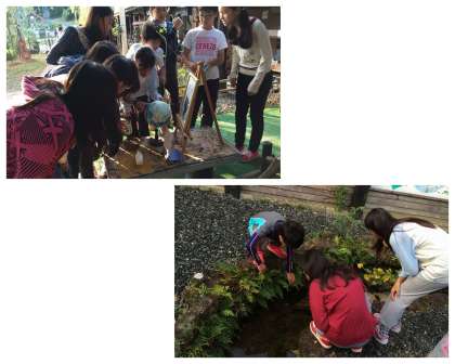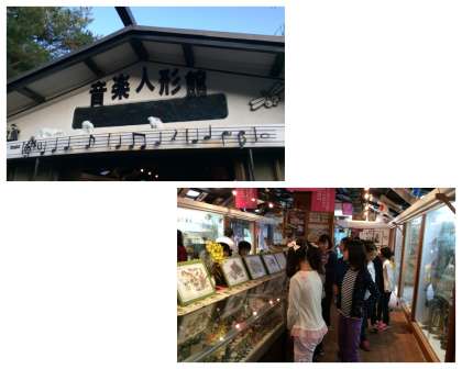 朝会の後、宿舎の裏山に散歩に出かけました。「メダカの学校」というビオトープや、楽器を持つ人形がたくさん展示されている「音楽人形館」を、ゆっくりと見て回りました。