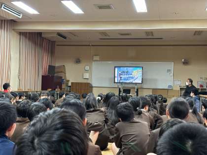 田辺中学校から中学校の先生が来てくださり、田辺中学校についてビデオを交えて紹介してくださいました。