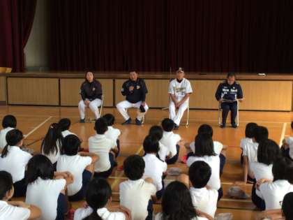 6年生は、オリックスバッファーローズのコーチ、トレーナーの方々を迎え、キャリア教育と体験学習を行いました。