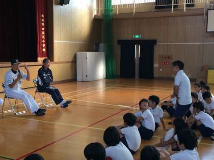 「夢をもってがんばること」「子どものうちからこつこつと努力を重ねる大切さ」について話をしていただきました。また、トレーナーの方からは、「バランスよく栄養をとる大切さ」を話していただきました。