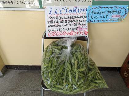 給食の献立に「えんどうの卵とじ」というメニューがありました。写真はそのえんどうを向いた時に出たさやです。むくのに4人で1時間かかったそうです。安全で美味しい給食を今日も食べることができるのも給食調理員さんのおかげですね。感謝していただきたいと思います。