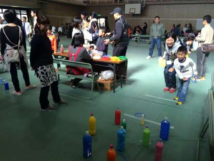 講堂には、PTAの方が用意してくださったストラックアウトや缶つり、コイン落としなどのゲームコーナーがあり、子どもたちも行列を作ってゲームを楽しんでいました。