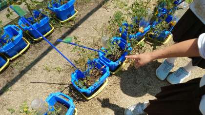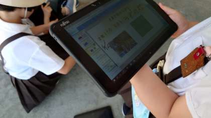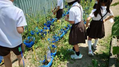 2年生が栽培しているミニトマトの水やりと観察をしていました。「まだ青いけどたくさん実がなっていた。」とうれしそうに話してくれました。また、タブレットを使って写真をとったり文章を書いたりして観察日記を書いていました。。