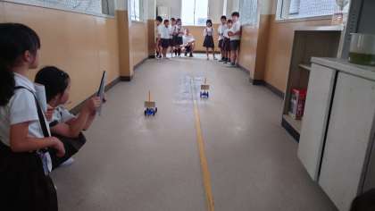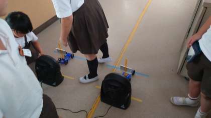 3年生の理科の学習の様子です。風の力で動く車をつかって風の働きを知る実験です。車の走る速さと風力との関係を発見することができました。