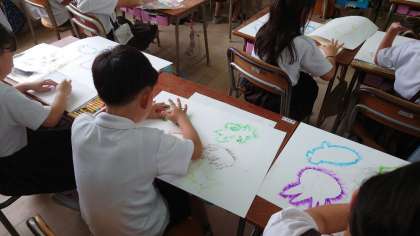 2年生の図画工作科の学習の様子です。型紙を切り抜いてパスで色を塗り、指でこすって型紙の形をぼかしながら写していました。どてもかわいらしい作品が出来上がりそうです。子どもたちも楽しそうに取り組んでいました。