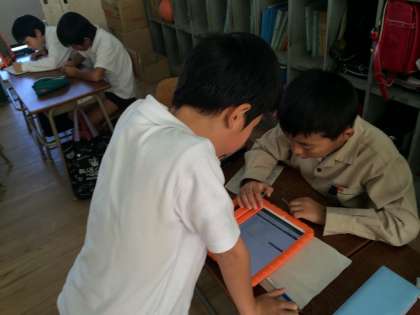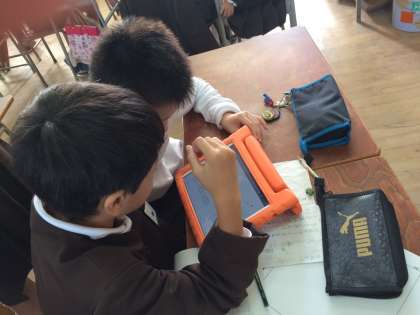 タブレット端末を使い、ペアになって自分たちが知りたいことをインターネットで調べていきます。