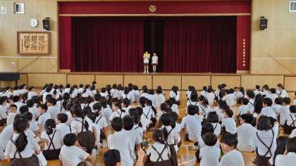 今日は、3年生と5年生のペア集会を講堂で行いました。舞台の中幕の間を通ったものをみんなで当てるゲームです。時には「もの」ではない場合もありました。短い時間ですが楽しい時間を過ごすことができました。