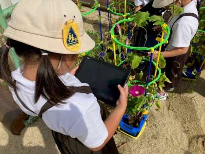 アサガオの観察で、タブレットを使って写真を撮っています。