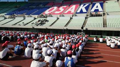 6年生がスポーツ交歓会に参加しています。開会式では、各学校の紹介や準備体操をしました。ウォーミングアップもすませ、もうすぐスタートです。