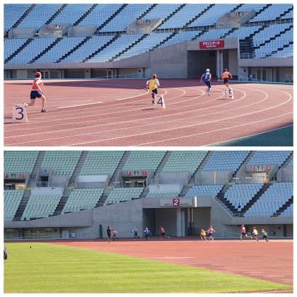 男子4×100mリレーの様子です。青のゼッケンが田辺小学校です。バトンをうまくつなぎトップでゴールしていました。