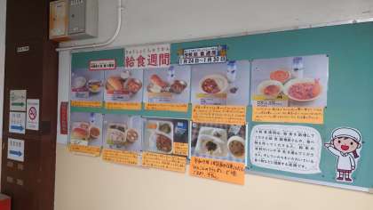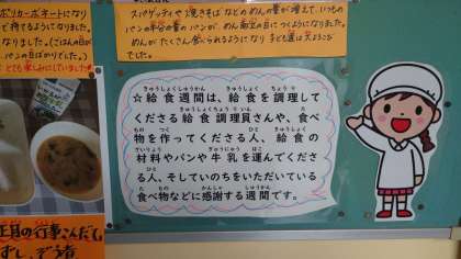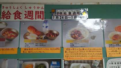 今日1月24日(金)〜30日(木)まで全国学校給食週間とされています。本校でもこの1週間を給食週間としています。給食室の掲示板には、「大阪市の給食の歴史」として各年代の給食の写真が掲示されています。