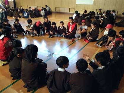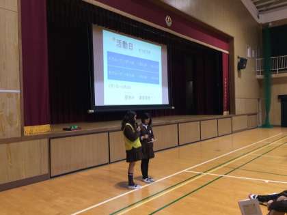 集会では、2〜3班のたてわり班が合体し、チームの名前を決めました。
