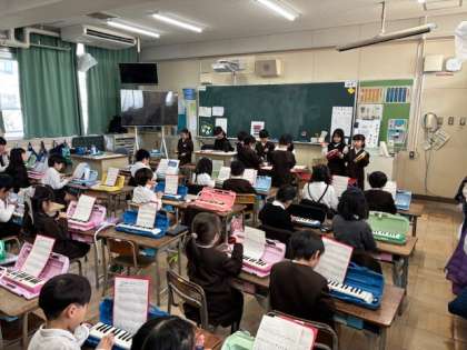 子犬のマーチの曲を木琴や鉄筋、タンブリンなどの楽器とあわせて、上手に演奏することができていました。