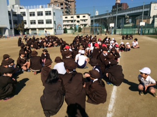 各自、安全な場所で身を守り、放送の合図で運動場に集まりました。