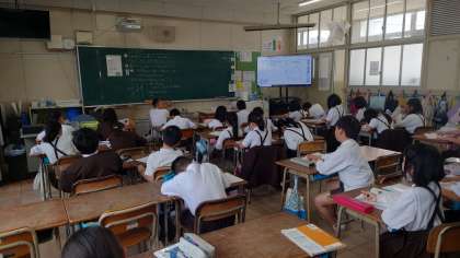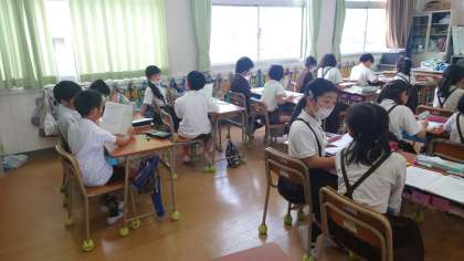 4年生の算数科の学習の様子です。折れ線グラフの学習をしていました。折れ線グラフの点と点との間をどう考えるか、グループや隣の人と自分の考えを交流していました。、
