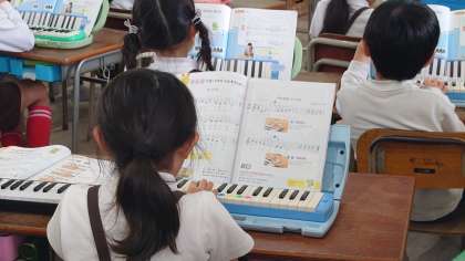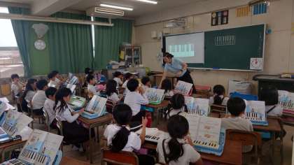 2年生の音楽科の学習の様子です。鍵盤ハーモニカを練習していました。モニターに映した鍵盤を見ながら一生懸命吹いていました。