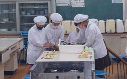 5年生が家庭科の調理実習に取り組んでいました。温野菜のサラダを作っていて、それぞれの班で盛り付けを工夫していました。