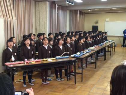2限目は、多目的室で音楽科を行いました。たくさんの保護者の方が見守るなか、合唱や鍵盤ハーモニカなどの合奏を行いました。
