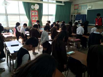 今日は、各学級で震災について振り返り、当時の様子や被害についての話を聞き、全員で黙祷しました。