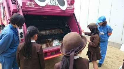 大阪市の環境事業局の方に来ていただき、パッカー車にゴミを入れる体験活動や、作業服を着せていただく体験を行いました。