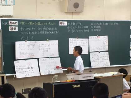 算数科「分数のわり算」の単元で、「分数のわり算の仕方を考えよう」をめあてに学習に取り組みました。