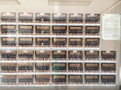 正門玄関ガラスケースに、学級写真を掲示しています。