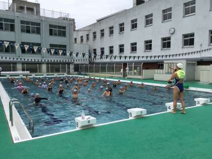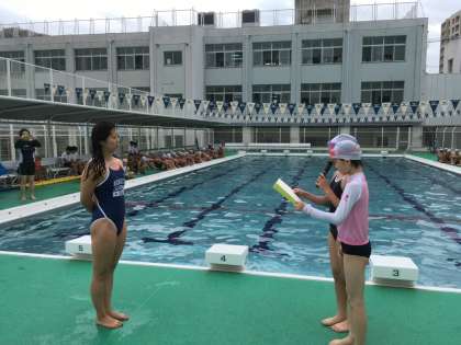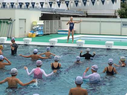 プールでは、1列になって6コースに分かれ、全体で1分30秒のシンクロナイズドスイミングの演技を作ります。