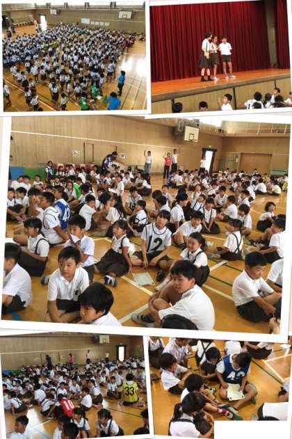 舞台に3人の集会委員がたち、同時に声をそろえて違うものの名前を言います。