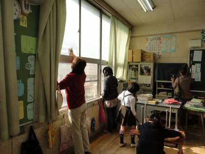 普段、手が届きにくい棚の上や窓ガラスをふくだけでなく、特別教室やトイレ、