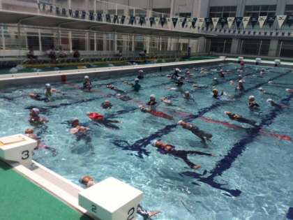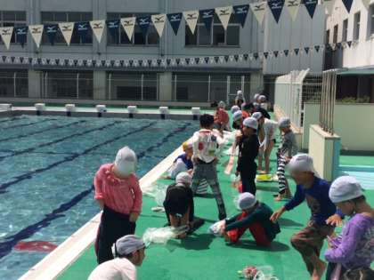 今日は今学期の水泳学習の最終日です。そこで、衣服を着たままプールに入る学習をしました。子どもたちは、衣服を付けた状態で水の中に入ったら、どうなるのかを体験しました。
