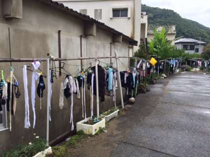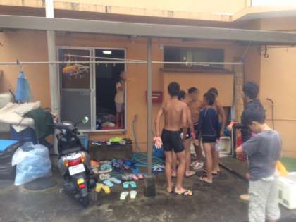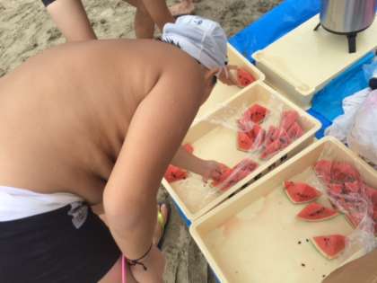午前の練習が終了しました。天気は徐々に回復しています。海から上がったあとは、スイカを食べて、お風呂に入りました。ほっと一息ついて、次は昼食です。