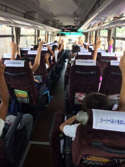 バス車内では、子どもたちはにぎやかに過ごしています。バスレクでクイズやものまね、ビンゴゲームをして盛り上がっていました。