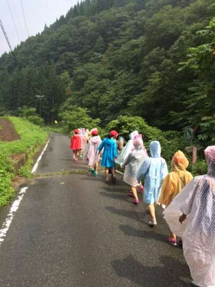 午後から予定していた川遊びと魚つかみは、天候急変のため、明日に延期します。大雨で川の流れが強くなってしまいました。