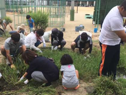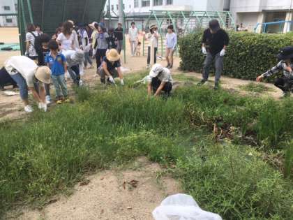 今日は、PTAビオトープ清掃がありました。朝早くから、たくさんの人が集まりビオトープ周りの雑草を抜きました。お家の方とともに、子どもたちも頑張りました。