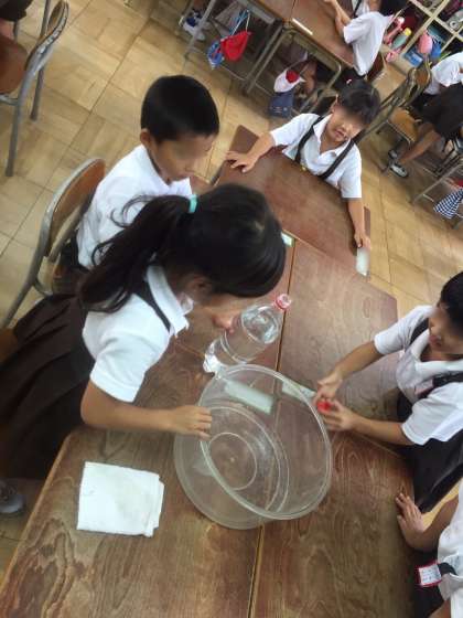 同じ量の水を異なる入れ物に入れたり、水の量の比べ方を考え試したりしました。