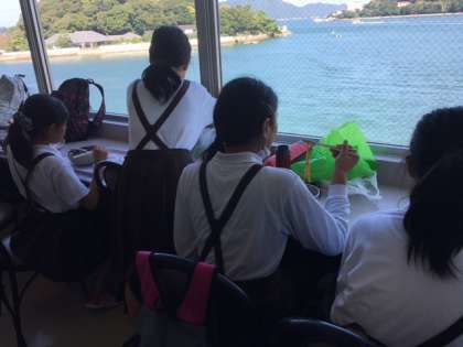 昼食はカツカレー、伊勢うどん、ハンバーグ、ラーメンセットの中から好きなものを選びます。レストランの中は修学旅行生で満杯ですが、オーシャンビューで食べることも出来ます。