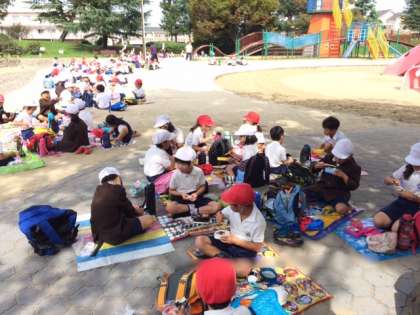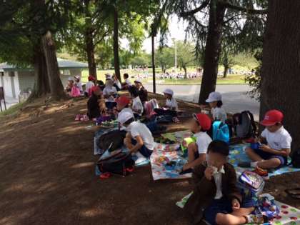 散歩の後は、班ごとにシートを広げて、みんなで楽しくお弁当を食べました!