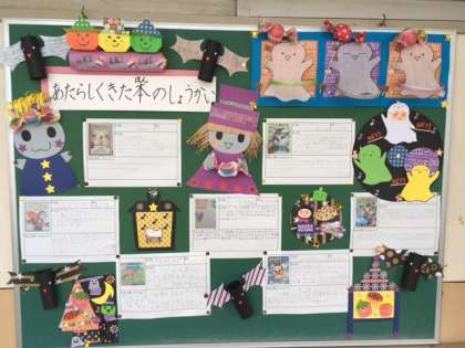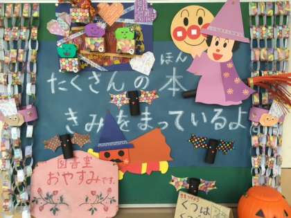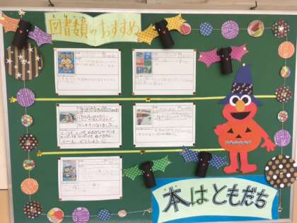 図書室掲示板では、図書委員会おすすめの本や新しい本の紹介が掲示されています。